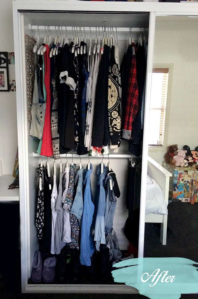 I took everything out. All of the clothes, hangers, shoes and random crap. Everything that was on an ugly hanger I removed and replaced it with the lovely white hangers. I rehung everything nicely, organised the shoes at the base, stored some stuffed animals and her amp above her closet. Put the bags in the corner near the shoes.